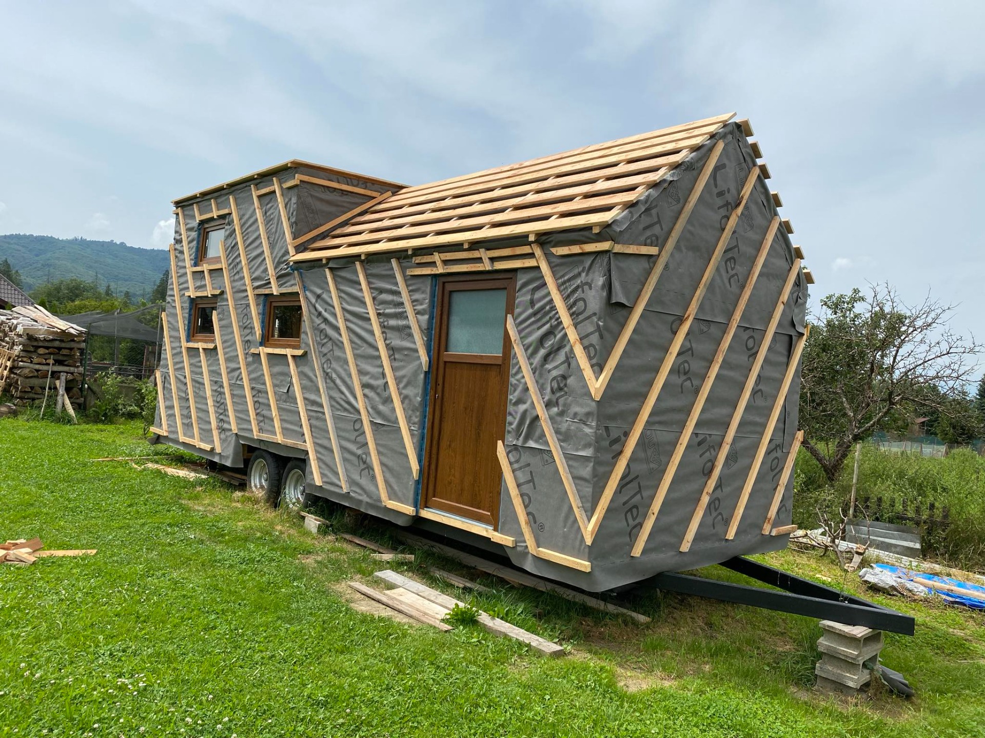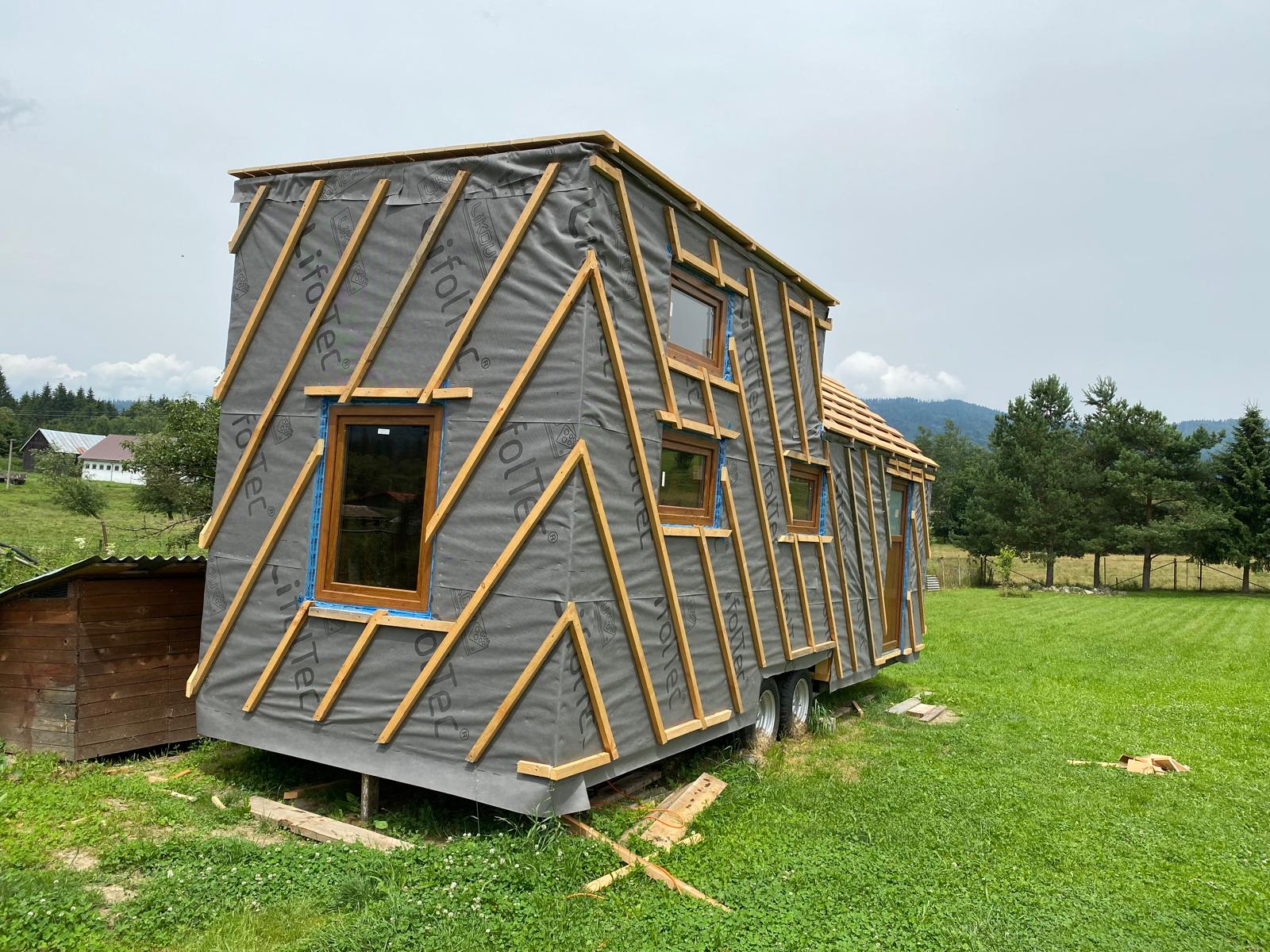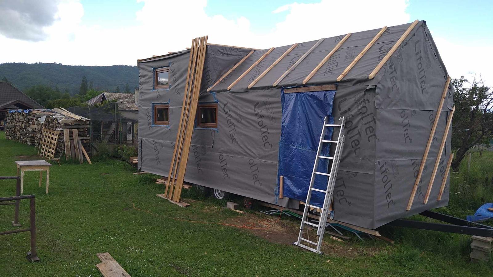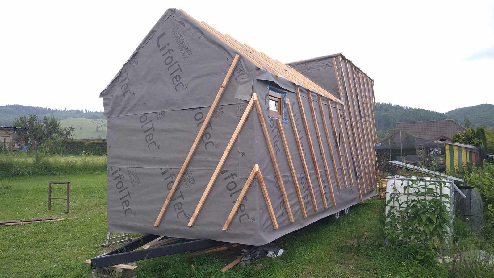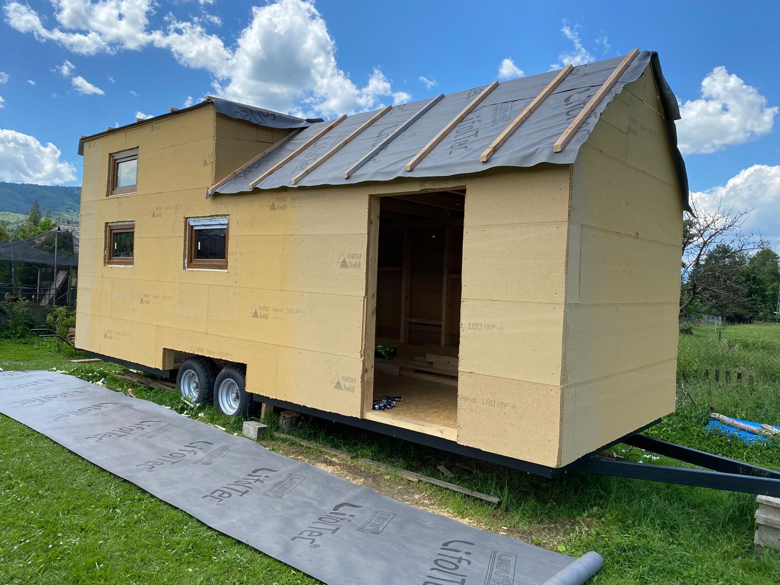 Použitá drevovláknitá doska má výborné tepelnoizolačné a protihlukové vlastnosti. Použila sa 35mm hrubá doska ktorá úplne vyhovuje spolu so 100mm izoláciou v konštrukcii. Po kompletnom zaklopení stien a strechy je nutné namontovať okná a dvere a pripevniť difúznu (paropriepustnú) fóliu po celom obvode. V tomto kroku nechávame stavbu trochu zmoknúť, ak by sa objavili nejaké zatekance a kvapky. Tie vieme následne ešte opraviť aby nezatekalo do konštrukcie.